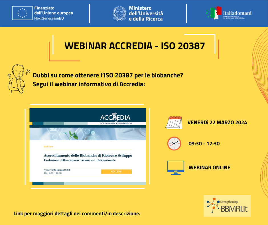 27 May 202427 June 2024WebinarAccredia, accreditation, BBMRI.it, biobanks, biomedical research, courses, EU, ISO20387, NextGenEU, NRRP, Research infrastructures Accredia Webinar – Accreditation of Research and Development Biobanks – March 22nd 2024 If you have any doubts on ISO 20387 accreditation for biobanks, we invite you to attend this webinar, offered by Accredia, on […] Read more