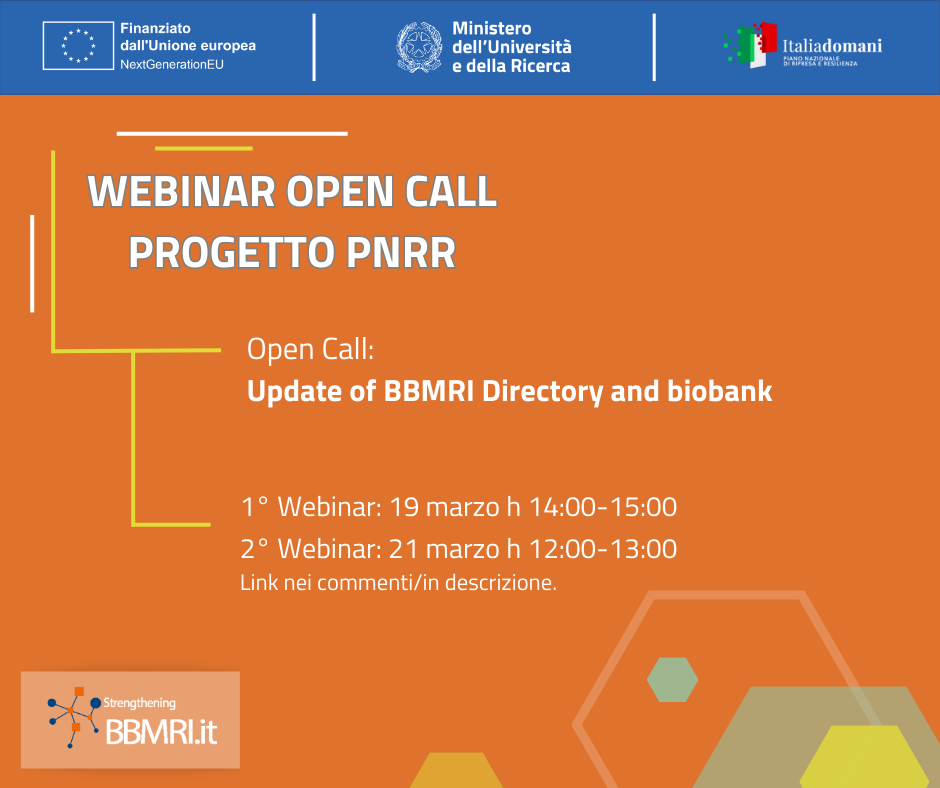 27 May 202427 June 2024WebinarBBMRI.it, biobanks, directory, EU, IR, NextGenEU, NRRP, open call, Research Infrastructure, webinar Webinar Open Call – March 19th, 21st 2024 The NRRP project Strengthening BBMRI.it, funded by Next Generation EU, also provides Open Calls for biobanks to facilitate digital and ethical-legal updates. […] Read more